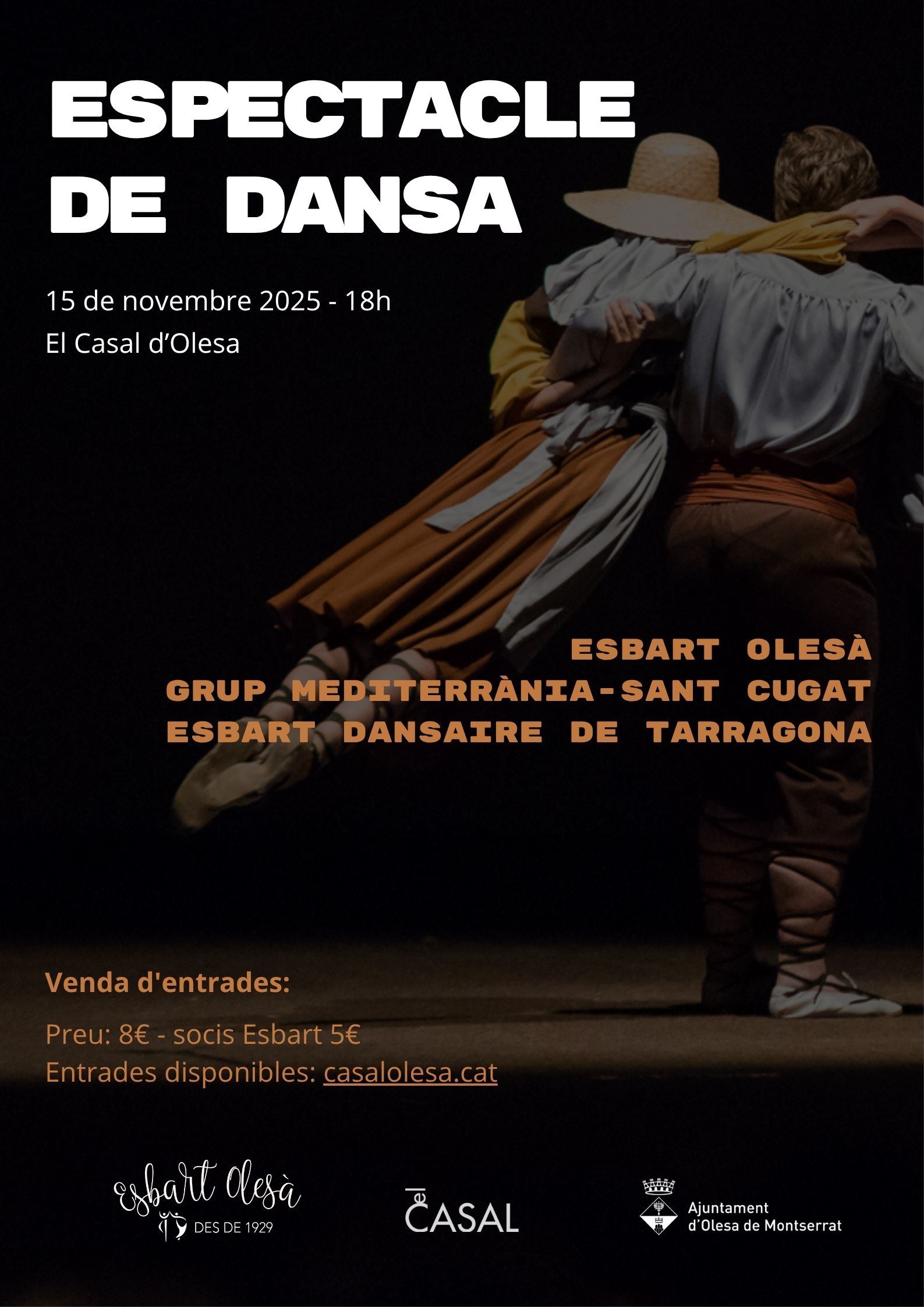 Gaudeix d’una tarda plena de música i tradició amb un espectacle de dansa que et farà vibrar! L’Esbart Olesà, el Grup Mediterrània i l’Esbart Dansaire de Tarragona s’uneixen per oferir coreografies plenes de ritme i emoció. Una celebració única per compartir la passió per les nostres arrels en un ambient festiu i proper.